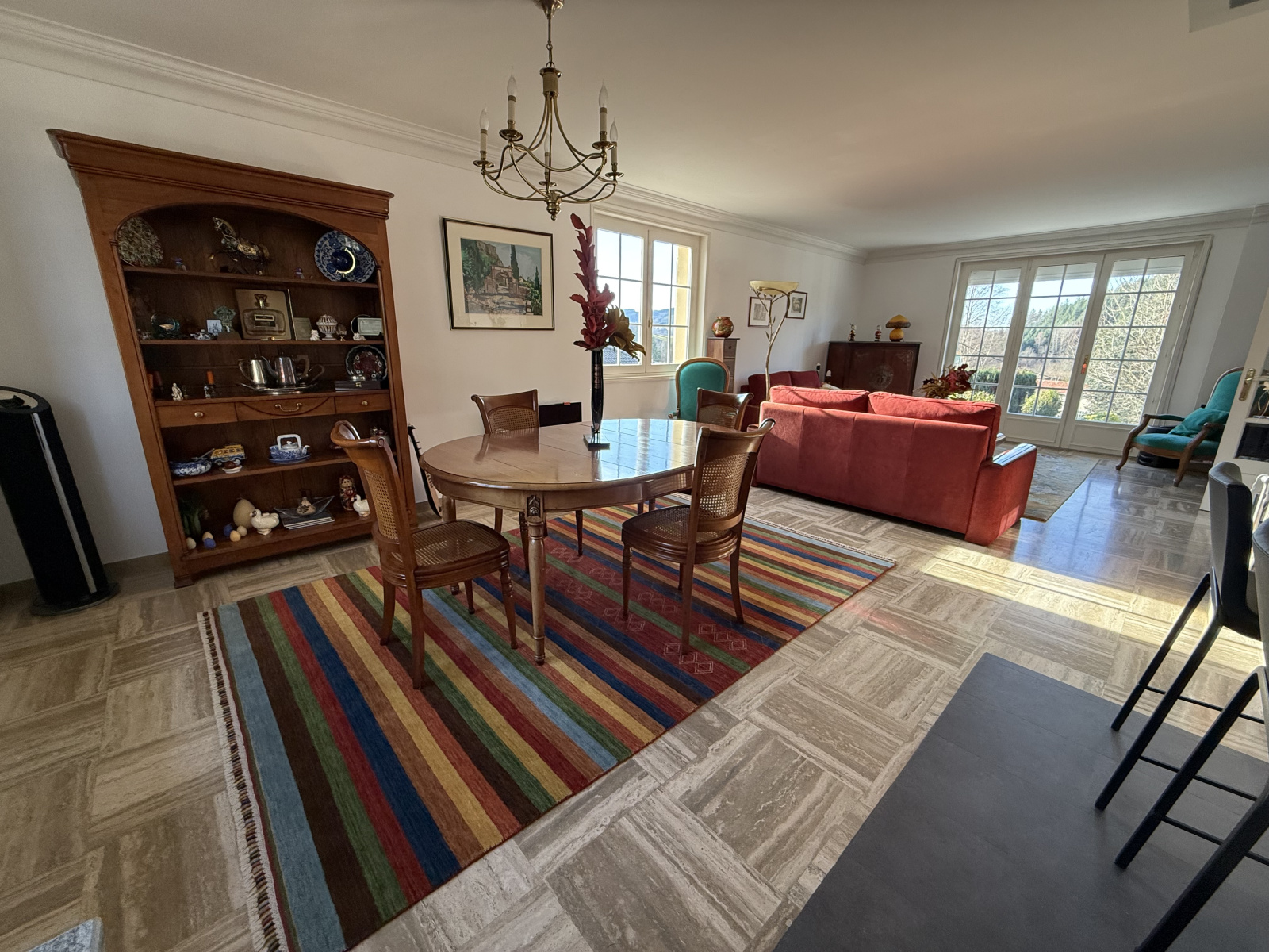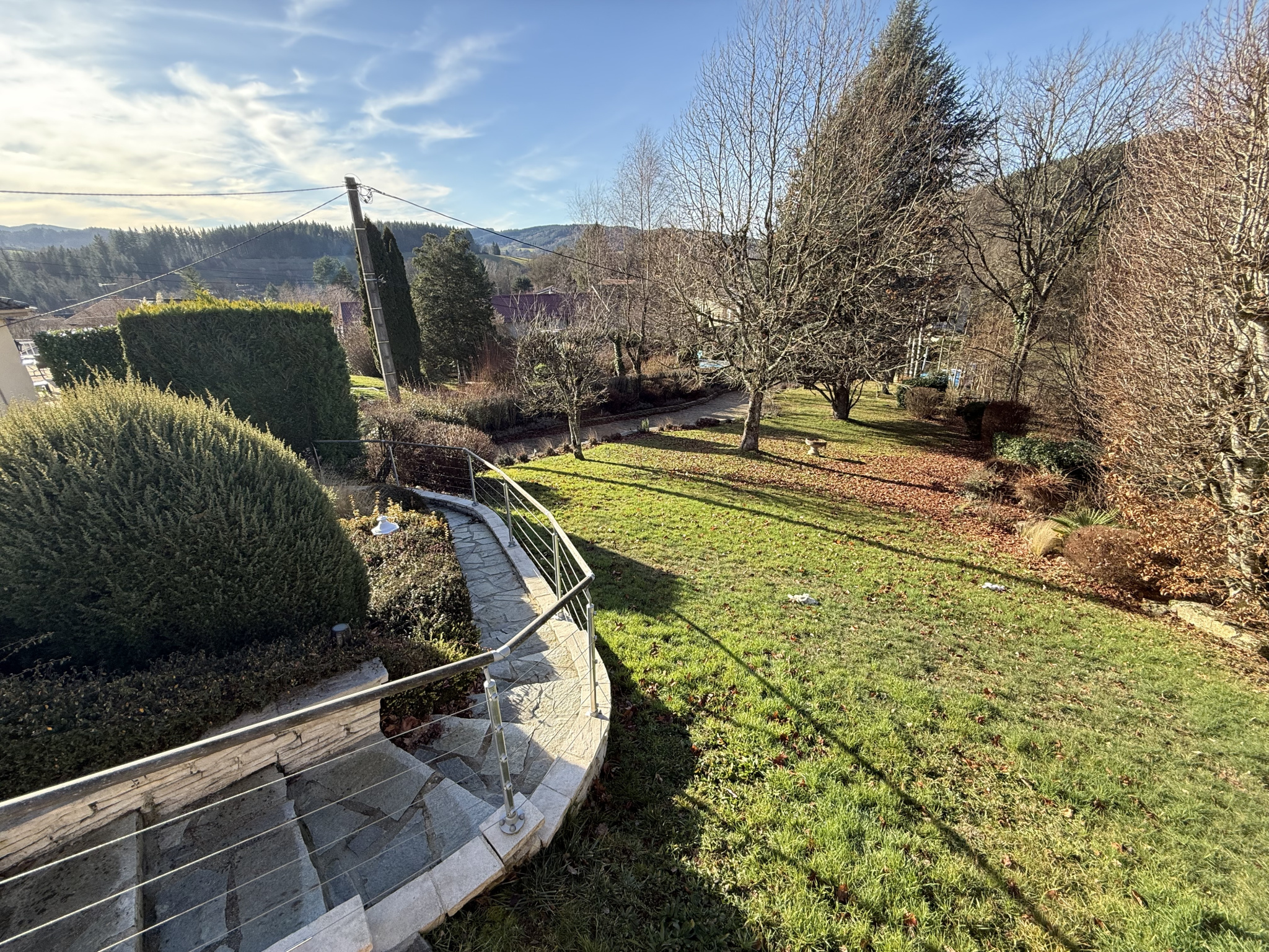 À l’extérieur, une terrasse de 30 m² s’ouvre sur un terrain arboré de plus de 1 500 m², exposé ouest et bénéficiant d’une vue dégagée.