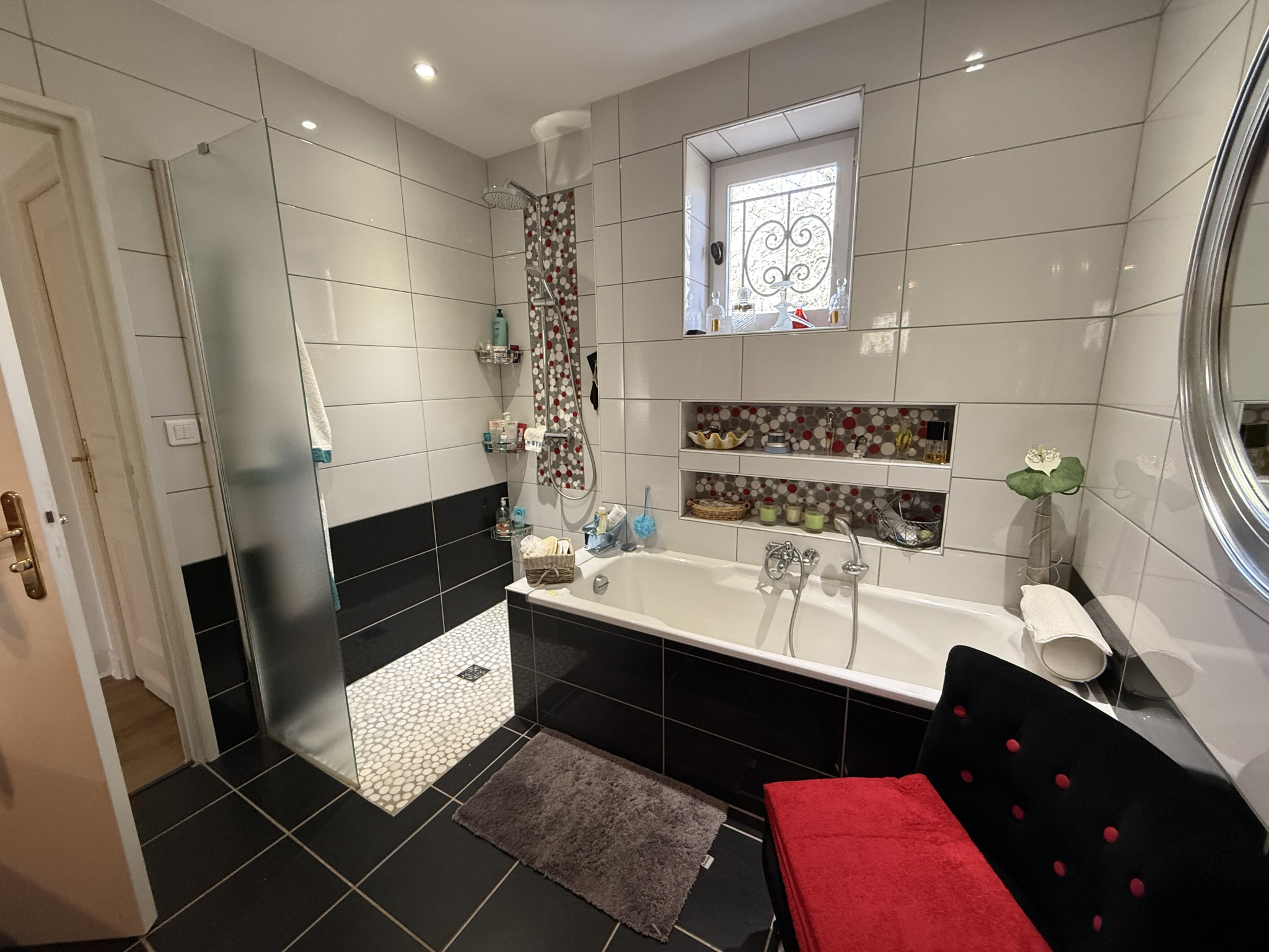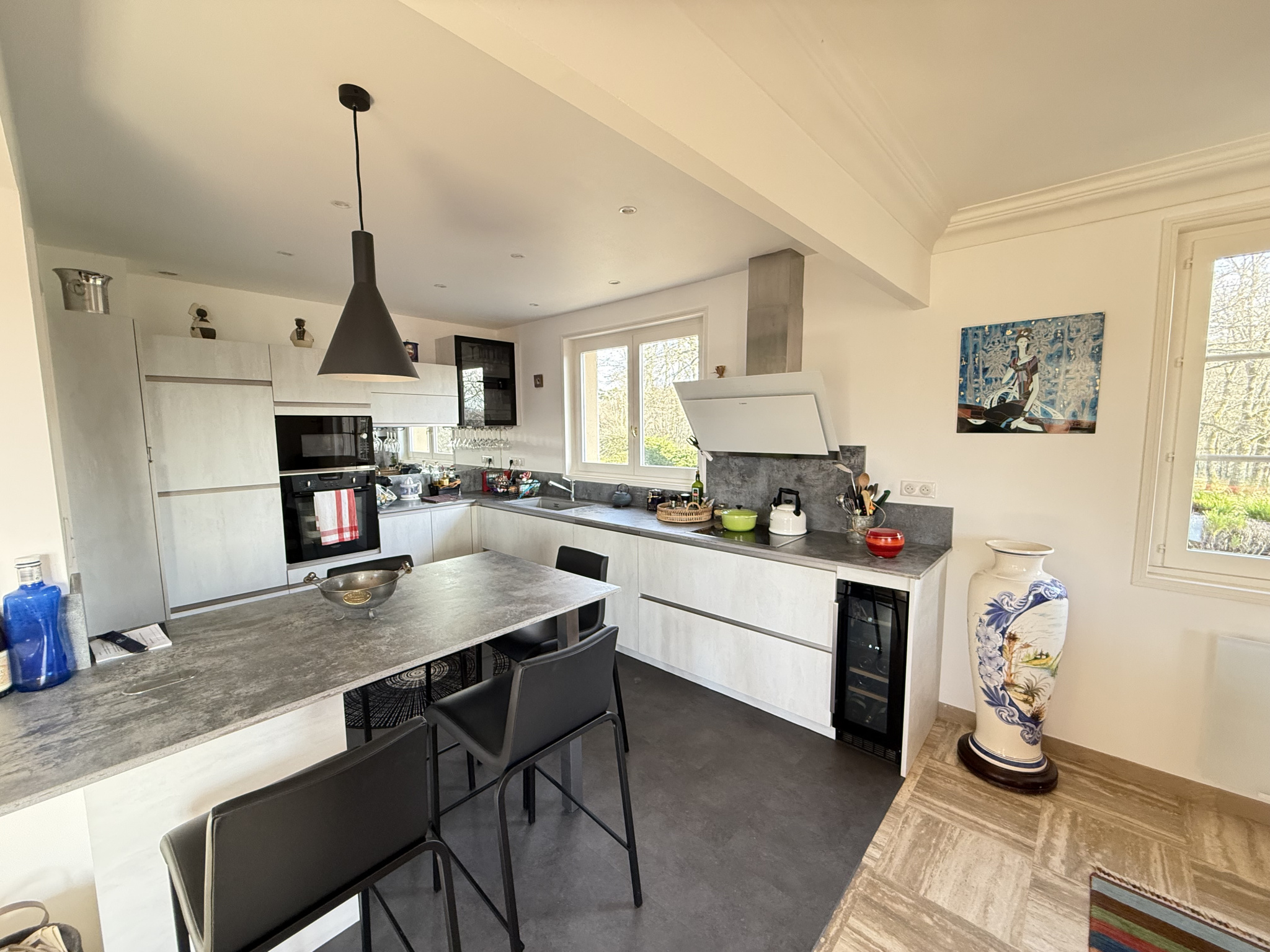 Édifiée sur sous-sol, elle propose au rez-de-jardin une belle pièce de vie de 47 m² avec cuisine équipée haut de gamme (électroménager inclus, plans de travail en pierre, cave à vin intégrée), ainsi que 3 chambres lumineuses et une vaste salle de bains avec douche à l’italienne, baignoire et double vasque.